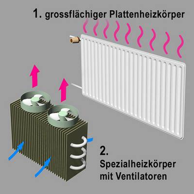 Inzwischen gibt es aber auch Radiatoren, die mit geringen Vorlauftemperaturen auskommen. Die technischen "Tricks" dieser wärmepumpen-betriebenen Heizkörper bestehen u.a. in wenig Eigenmasse, raschem Aufheizen und interner Temperatur-Steuerung. Spezialheizkörper mit Ventilatoren erzeugen Luftströme, die Staub aufwirbeln. Dadurch büßen sie allerdings an Behaglichkeit ein.