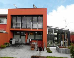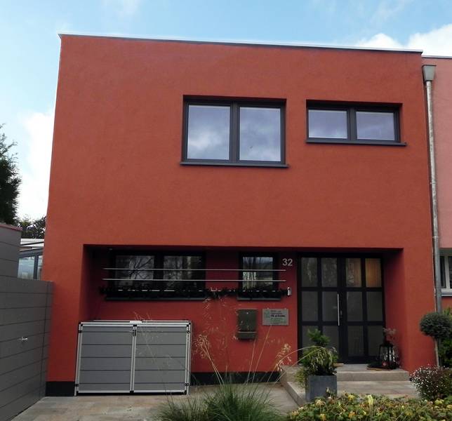 Das Reihenendhaus aus den frühen 1970er-Jahren war weder eine Schönheit, noch strotzte es vor Wohnkomfort. Doch mit der Außendämmung kam auch das neue Design: Klinkerwände und Einheits-Look verschwanden, Fenster kamen hinzu, wurden versetzt oder vergrößert. Ein neuer Putz und ein frischer Anstrich taten das Übrige. Die schmucklose Südseite des Hauses beherbergt jetzt sogar einen Wintergarten, der ehemals verschattete Balkon ist Teil des luftigen Arbeitszimmers.
